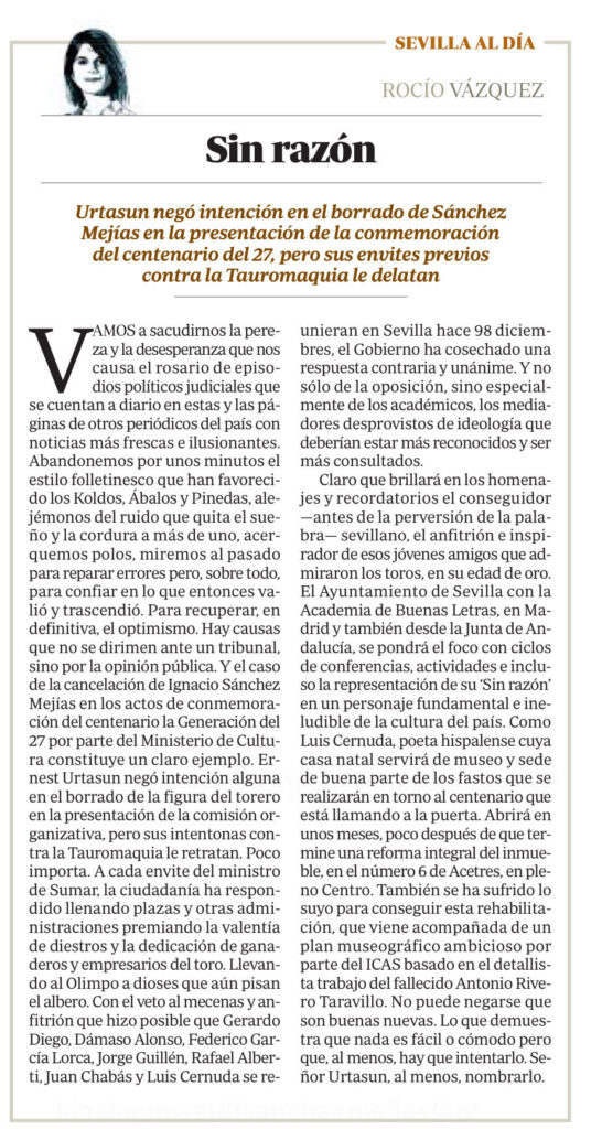 Pero pasados casi seis meses ha sido la familia, en la figura de mi prima María Dolores Sánchez Mejías, nieta de Ignacio, la que ha mostrado su postura en una entrevista en ABC de Sevilla, que tuvo los honores de portada. A raíz de esto, han sido muchos medios los que han escrito sobre ello, y muchas organizaciones y personas las que han mostrado su indignación en las redes sociales, señalando al ministro cuanto menos de sectario, por excluir de los actos al que fue artífice y mecenas de la de la Generación del 27 por el mero hecho de ser torero. Les dejo enlazados los artículos de ABC , Aplausos o El Debate como ejemplo, y hasta anuncian que se va a representar su obra de teatro “Sin Razón” como homenaje al 27, aquí el enlace de la noticia en ABC.