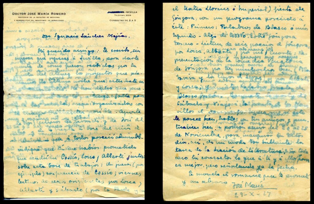 Se la dirige a Ignacio, José María Romero, que era entonces vocal encargado de la sección de literatura del Ateneo de Sevilla, además de subdirector del Manicomio de Miraflores, cercano a Pino Montano (de las charlas entre ambos seguro que saldría la idea de la obra de teatro “Sin Razón”). Está fechada en octubre de 1927, y le escribe a Ignacio para preparar los anteriormente citados actos.
